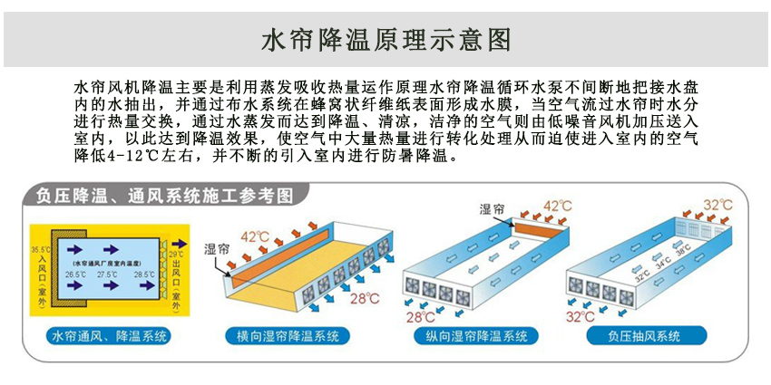 (水帘)湿帘降温系统简单来说它就是湿帘+负压负机的一种组合降温系统,其它降温原理就是利用负压风机抽风让室内形成负压,利用负压的带动将室外新鲜空气通过湿帘降温过滤后送入到车间内,从而达到一个通风、降温、增湿的目的。