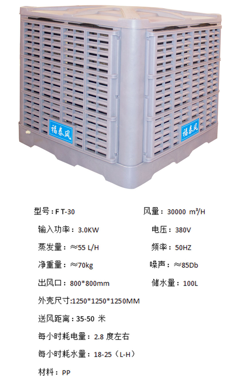 100-150㎡厂房换气降温每小时只耗用1度电,敞开式软管分水盘布水系统,淋水均匀畅顺。带过()电压、过水流、缺相保护,自动(手动)清洗功能。创新调速技术,可根据实际需要调节风量,行业独创风机反转、具备抽风功能,瞬间变送风为抽风。上、下、侧出风三种出风形式的安装方式可应用于各种不同环境的工程需求。PP环保工程塑料,防老化,抗紫外线,使用寿命长。